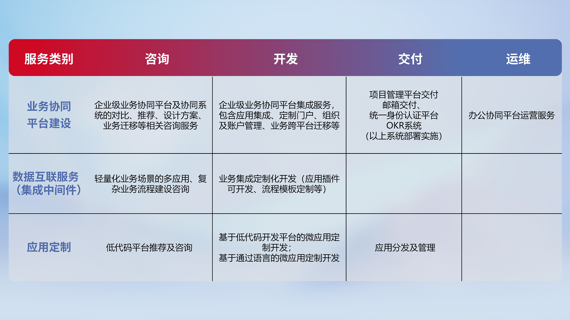 针对钉钉、、、、企微、、IDaas等平台级产品提供产品的规划、、方案、、、交付、、定制化开发等服务,,,实现如统一协同办公、、、、智能客户服务、、、、混合会议管理、、、智能数据查询、、等业务场景,,,,实现数字化转型。。。