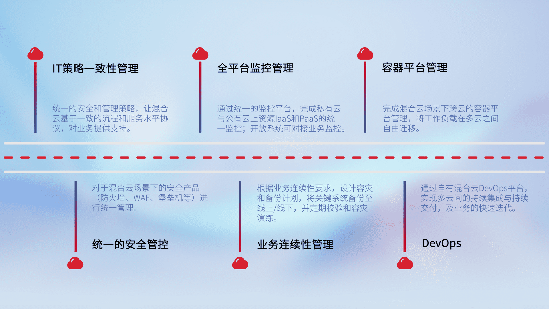 通过多云纳管,,,,以统一的资源数据模型把客户的云资源进行抽象和封装,,,,进而实现对多云资源的统一操作,,,保障云资源管理的可靠性、、、稳定性与可用性。。。。量身定制化运维内容,,,,配置、、、开发运维、、补丁管理、、、备份、、、、监控、、、认证和访问管理、、、审计和日常巡检等,,,保障在用云过程中的可靠度,,,稳定度以及高可用率。。。。